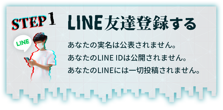実名やメールアドレスは非公開OK。LINEが使える状態の端末をお持ちならすぐに開始できるので家族や職場に知られることもなく秘密で遊べます。 基本登録無料なので少しでも興味がある方は是非お試しください。